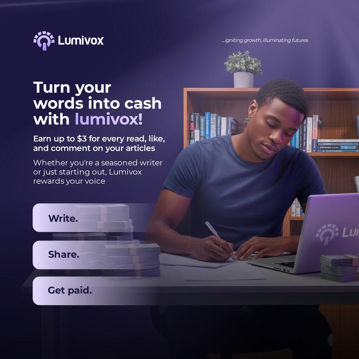 Lumivox rewards you for each article you upload. Create articles, wait for approval and start earning once approved. You earn more when users engage in your article by reading, liking and commenting
